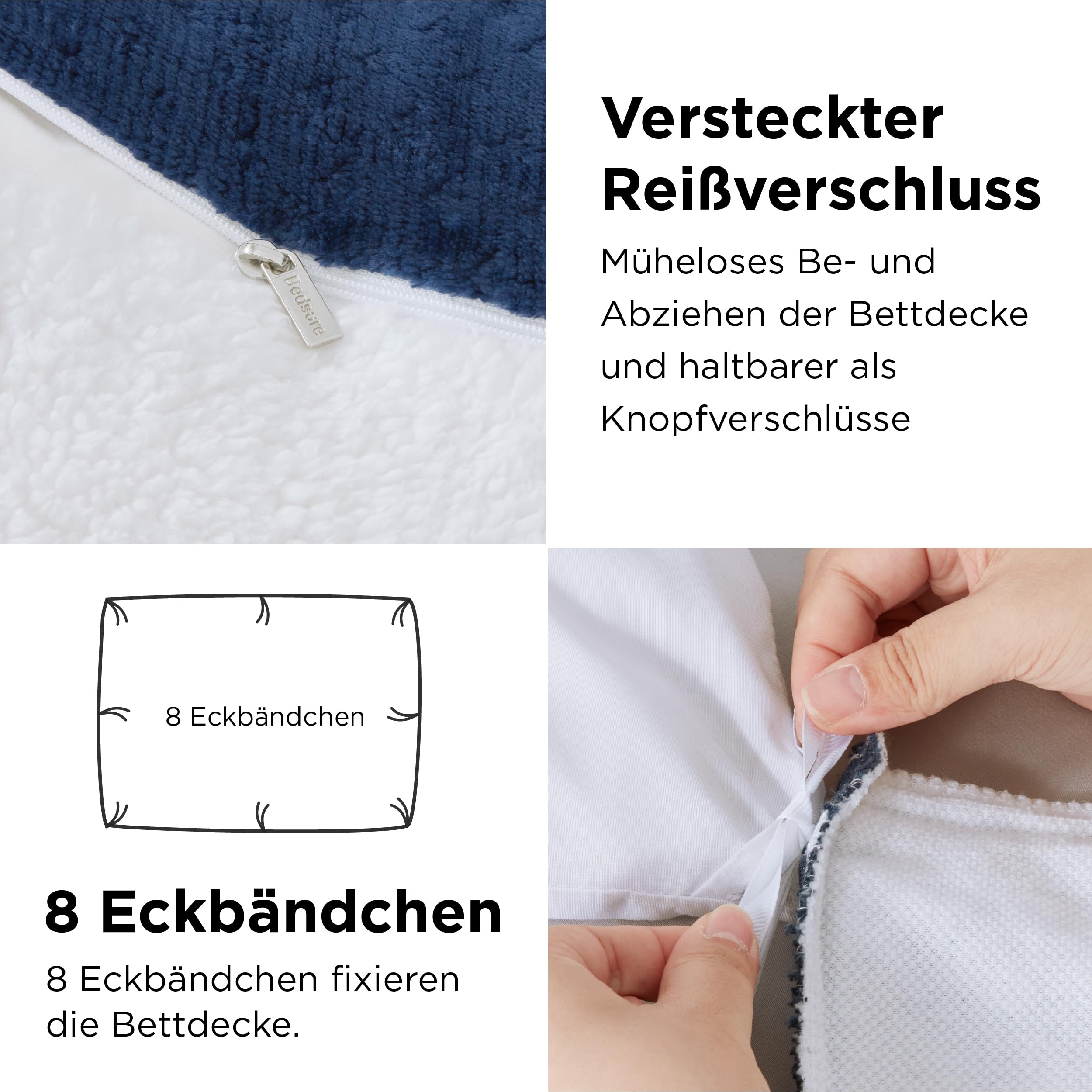 Perfect fixation: 8 practical ribbons are sewn on to the microfibre fleece bed linen to prevent the duvet from slipping back and forth in the bed linen blue or always coming up on a corner. This ensures a carefree sleep at night.