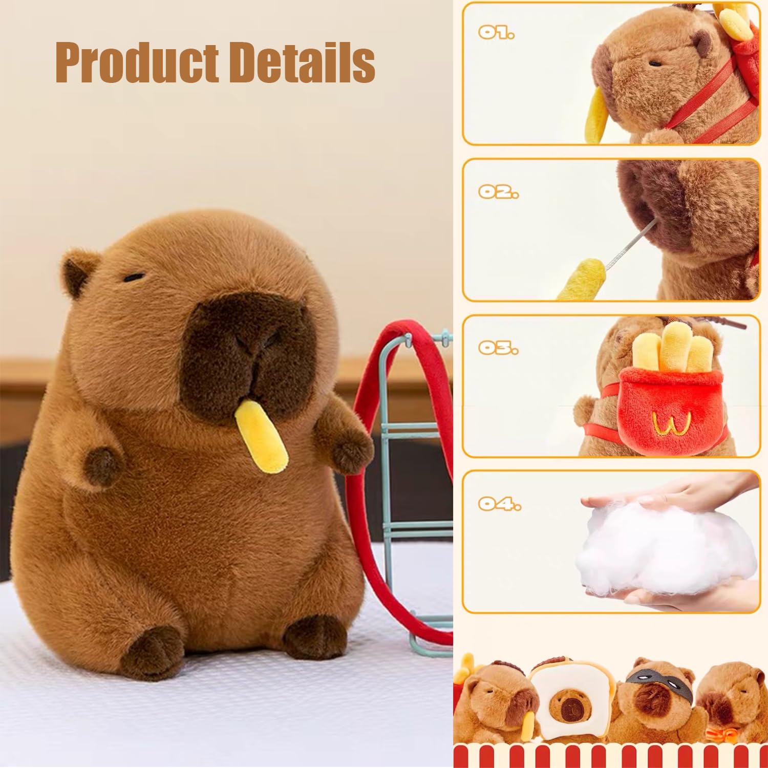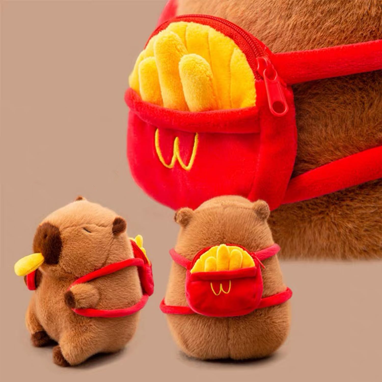 Эта очаровательная плюшевая игрушка-капибара с картошкой фри во рту и рюкзаком в форме картошки фри на спине — забавный и привлекательный персонаж, который понравится и детям, и взрослым. Выполненная в теплом коричневом цвете, плюшевая игрушка имеет мягкую, уютную текстуру и тщательно прошитые детали.