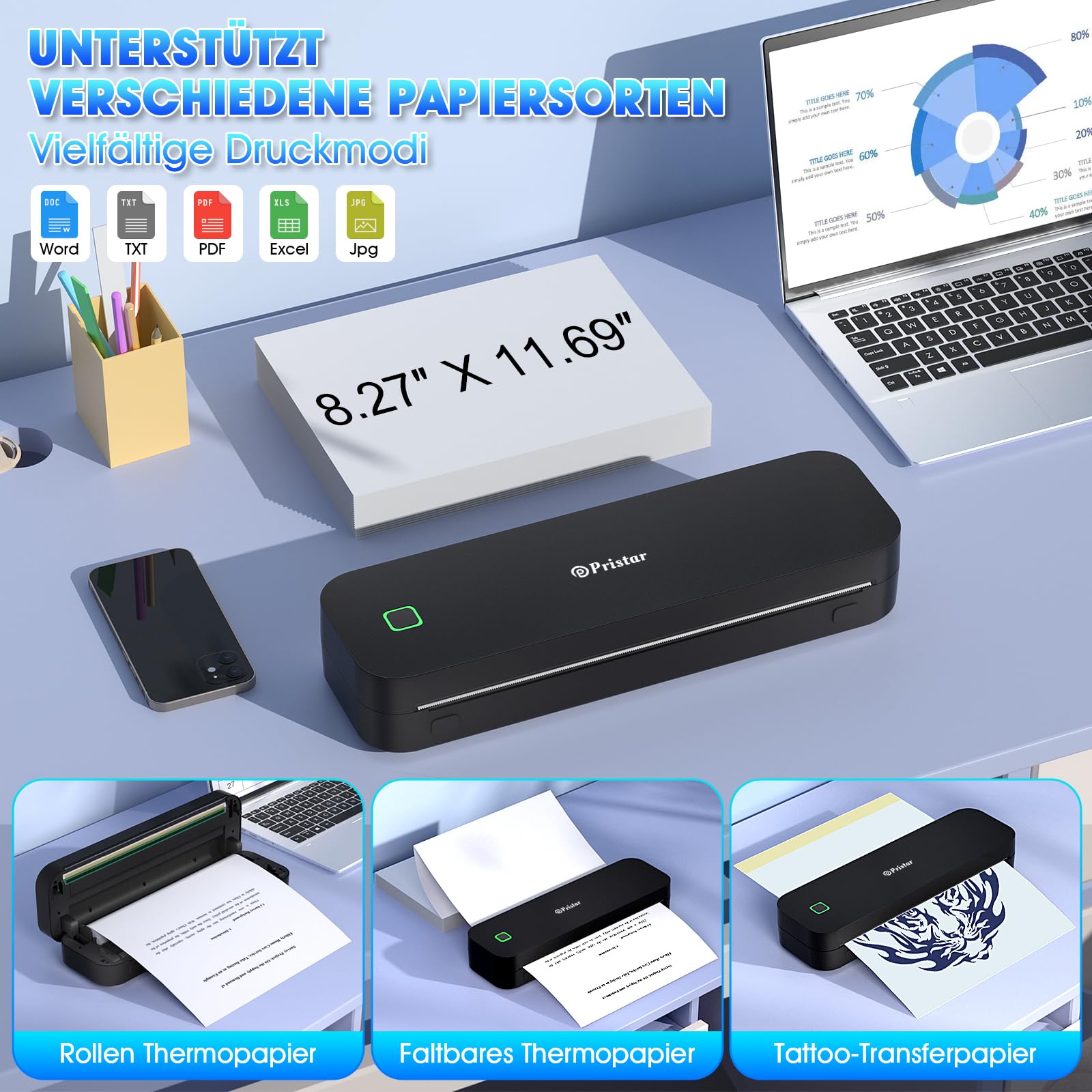 The Pristar D210 portable A4 thermal printer is a compact and lightweight wireless printer designed for convenient printing anytime, anywhere. Compatible with iOS and Android devices, it easily connects via Bluetooth, making it ideal for on-the-go work, travel, home, or small business use.