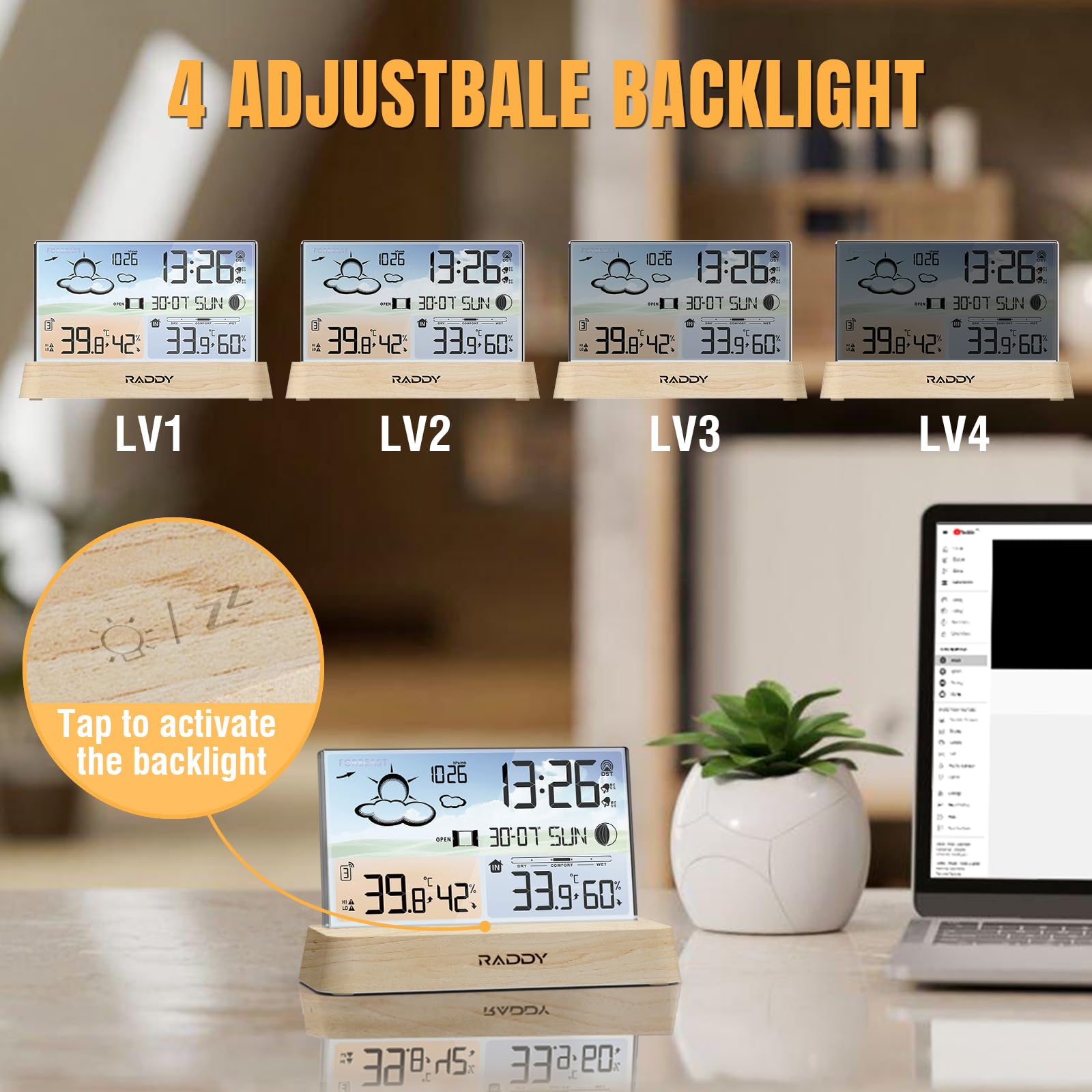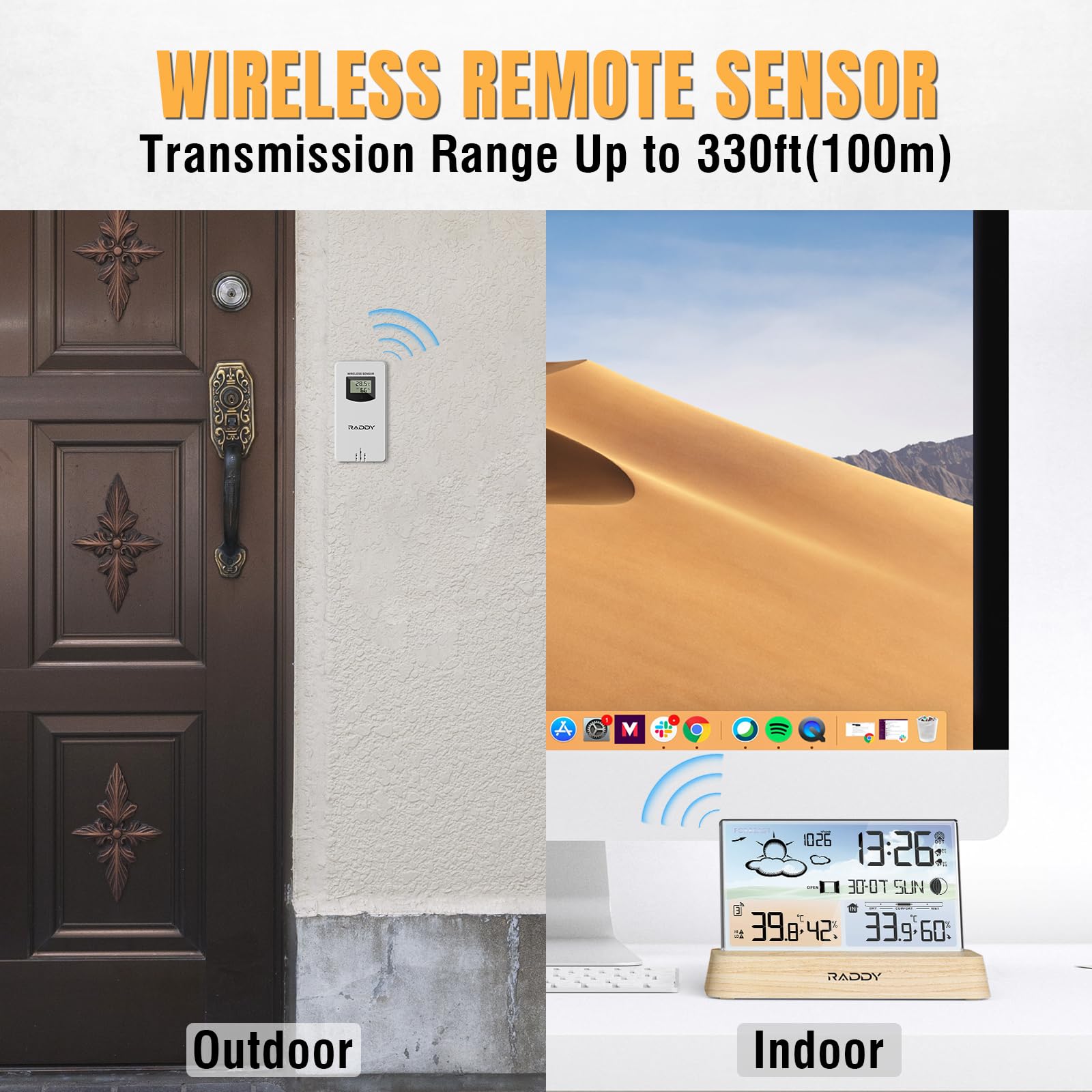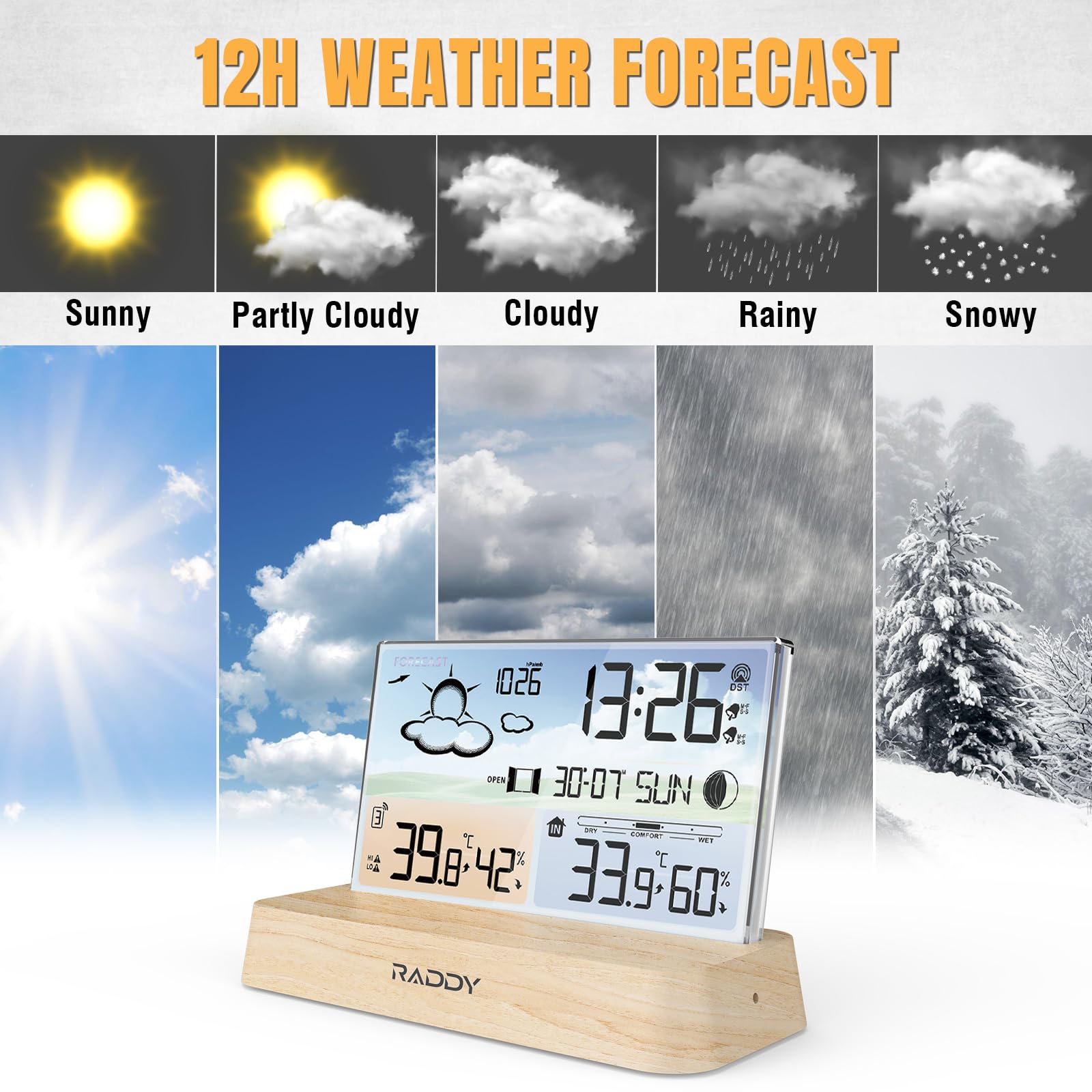 Raddy DT6 Weather Station Indoor Outdoor DCF Radio Clock, Digital Colour Display, Indoor and Outdoor Thermometer, Hygrometer, Home Weather Station with Weather Forecast and Barometer