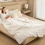 PREMIUM FABRIC: This double-sided faux rabbit fur blanket is crafted from 750 g/m² fabric with a crystal-clear velvet lining. The selected fabric density provides the perfect balance of warmth without overheating, ensuring year-round comfort. Versatile Use: Our large fluffy bubble blanket is perfect for use as a bed blanket, sofa throw, sleep blanket, air conditioning blanket, lap blanket, travel blanket, or pet blanket. It makes a luxurious and warm surprise for your loved ones as a birthday or holiday gift.
